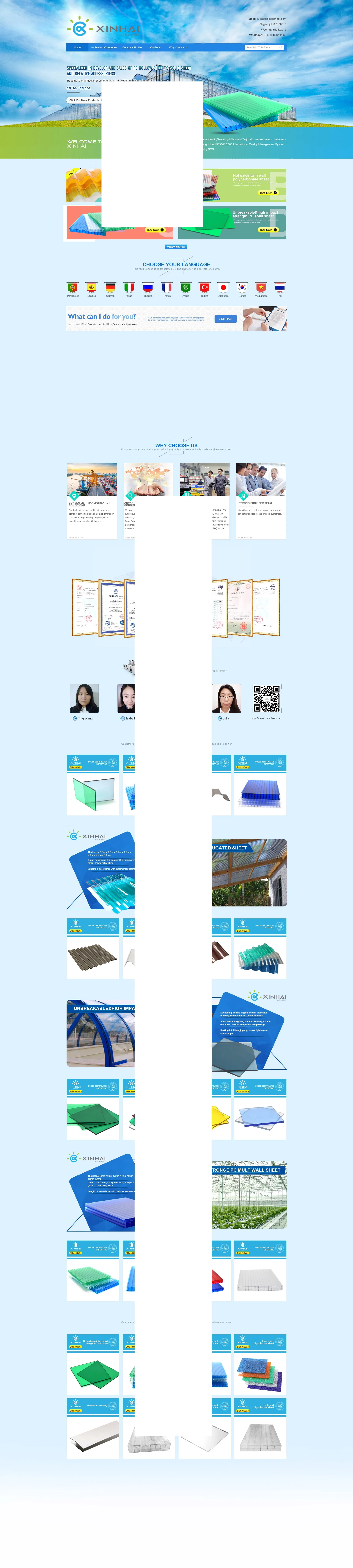 Productos principales:Hoja de policarbonato hueco, hoja de policarbonato sólido, hoja de policarbonato corrugado, hoja de policarbonato de bambú, perfiles de policarbonato